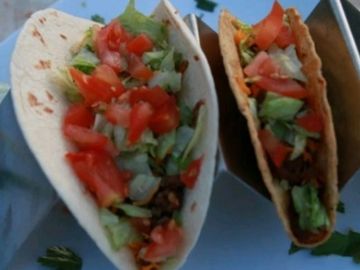 Choice of seasoned ground beef or chicken served in a corn or flour tortilla. Topped with shredded cheese, lettuce, and tomato. Served with rice.