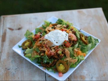 Green salad topped with seasoned ground beef, shredded cheese, tomato, sour cream, salsa, green onion, cilantro, jalapeno pepper, and tortilla chips.