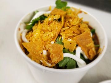 Warm up with this perfectly seasoned blend of ground beef, corn, variety of beans, and many more vegetables. Topped with cheese, green onion, cilantro, sour cream, and tortilla chips.